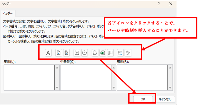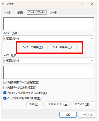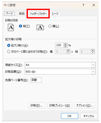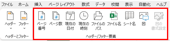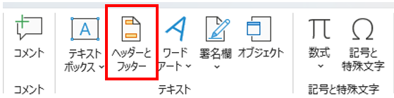 もしくは「フッター」をクリックすることで、ページ数やシート名などの編集を