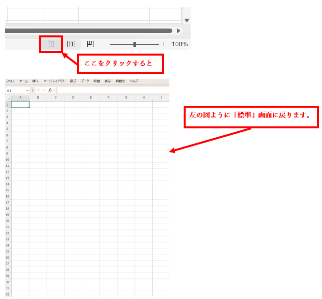 「ページレイアウトビュー」画面から「標準」画面に戻り、