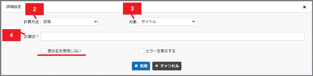 「表示名を使用しない」のチェックをONにすることで、画面上にて重複する項目名があった際、意図しない計算結果となることを防ぐことができます。